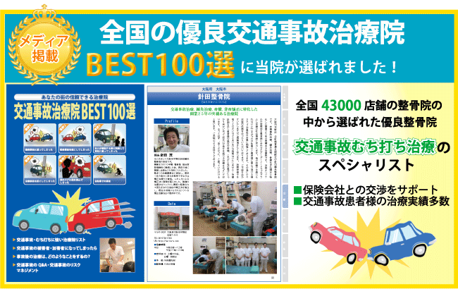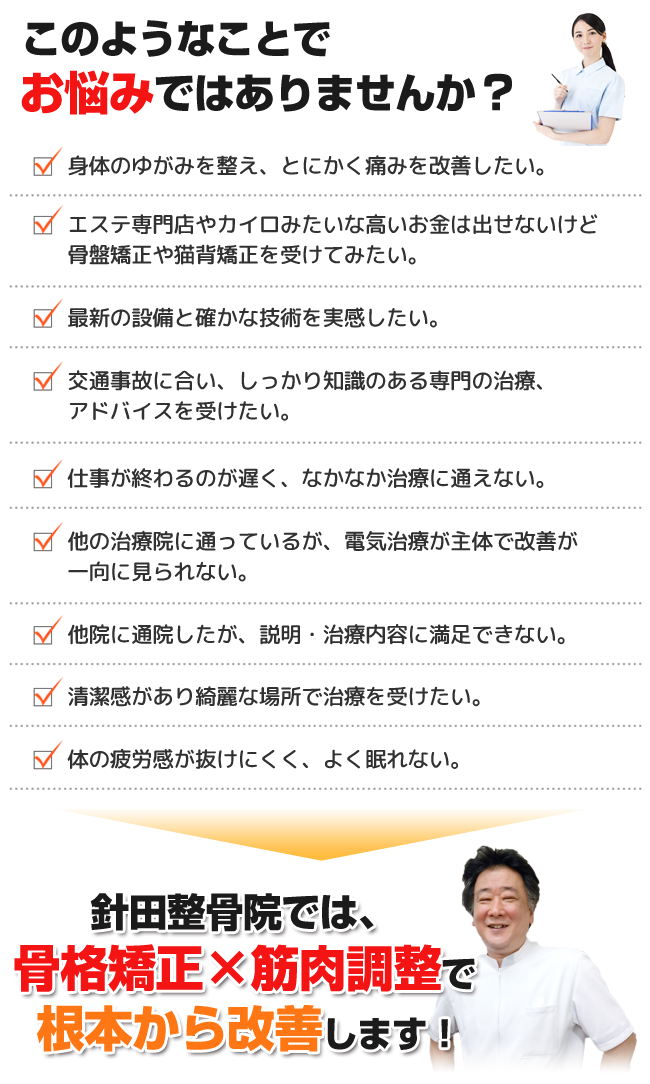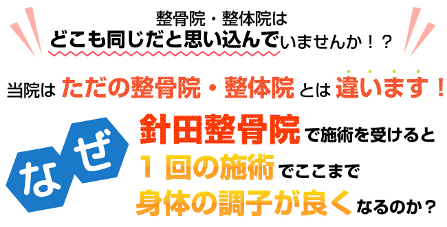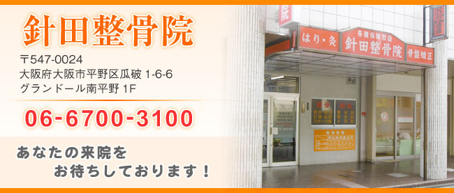 平野区の針田整骨院のHPへようこそ。当院は約30年の歴史と実績がある整骨院と自負しております。腰痛や肩こり、ぎっくり腰や膝の痛み、スポーツ障害や交通事故によるむち打ち症状などありとあらゆる症状に対して的確な施術を行わせて頂いております。当院はスタッフ全員が厚生労働省認可の国家資格者を有しておりますので安心して施術を受けて頂くことができると思います。スポーツの試合を控えていて「できるだけ早く症状を改善したい」とお考えの患者様にもきっとお役に立てると思います。是非お気軽にお問い合わせ下さいませ。